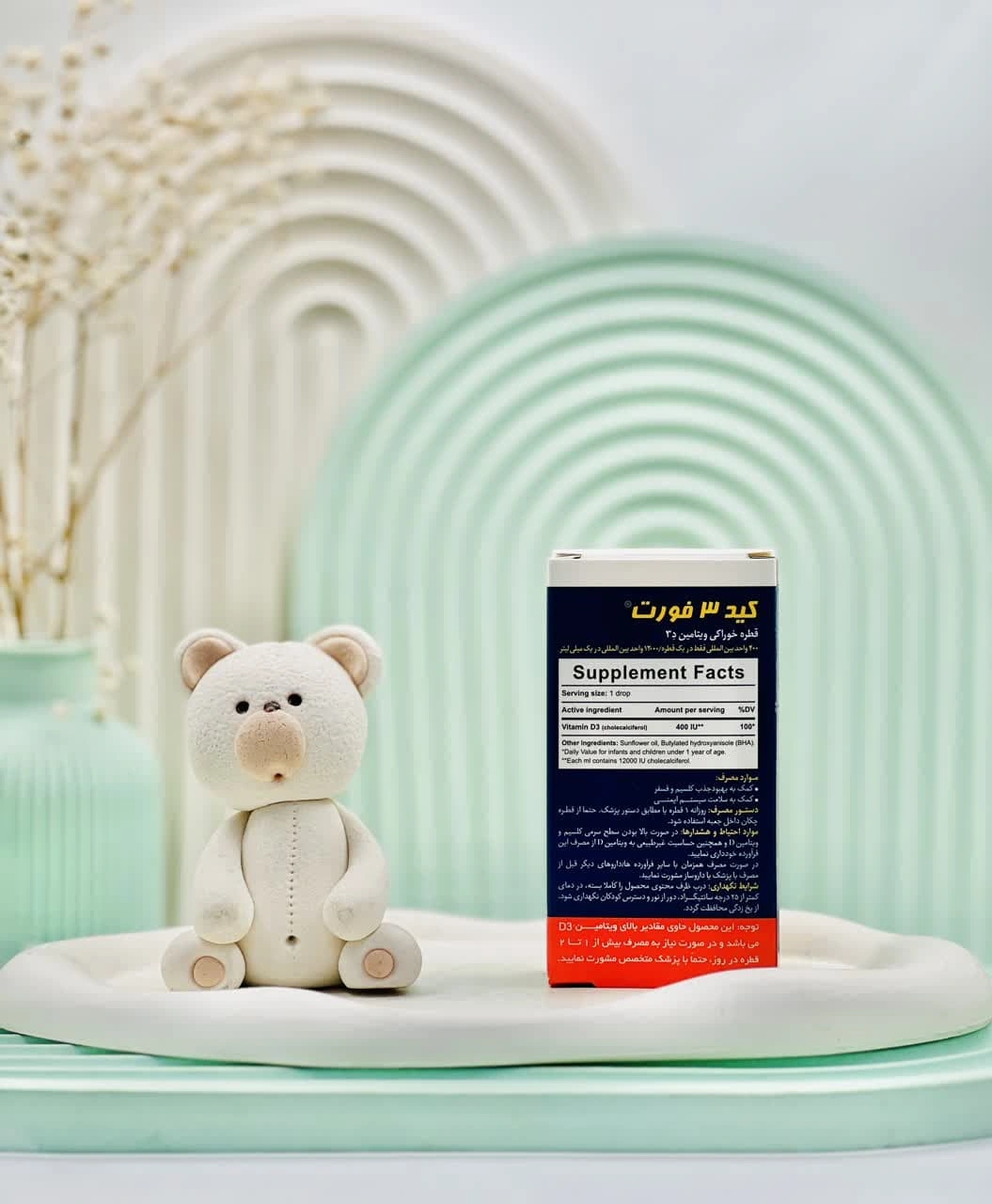 | مقدار ویتامین D3 در هر میلیلیتر | 12000 IU (معادل 400 واحد در هر قطره) |