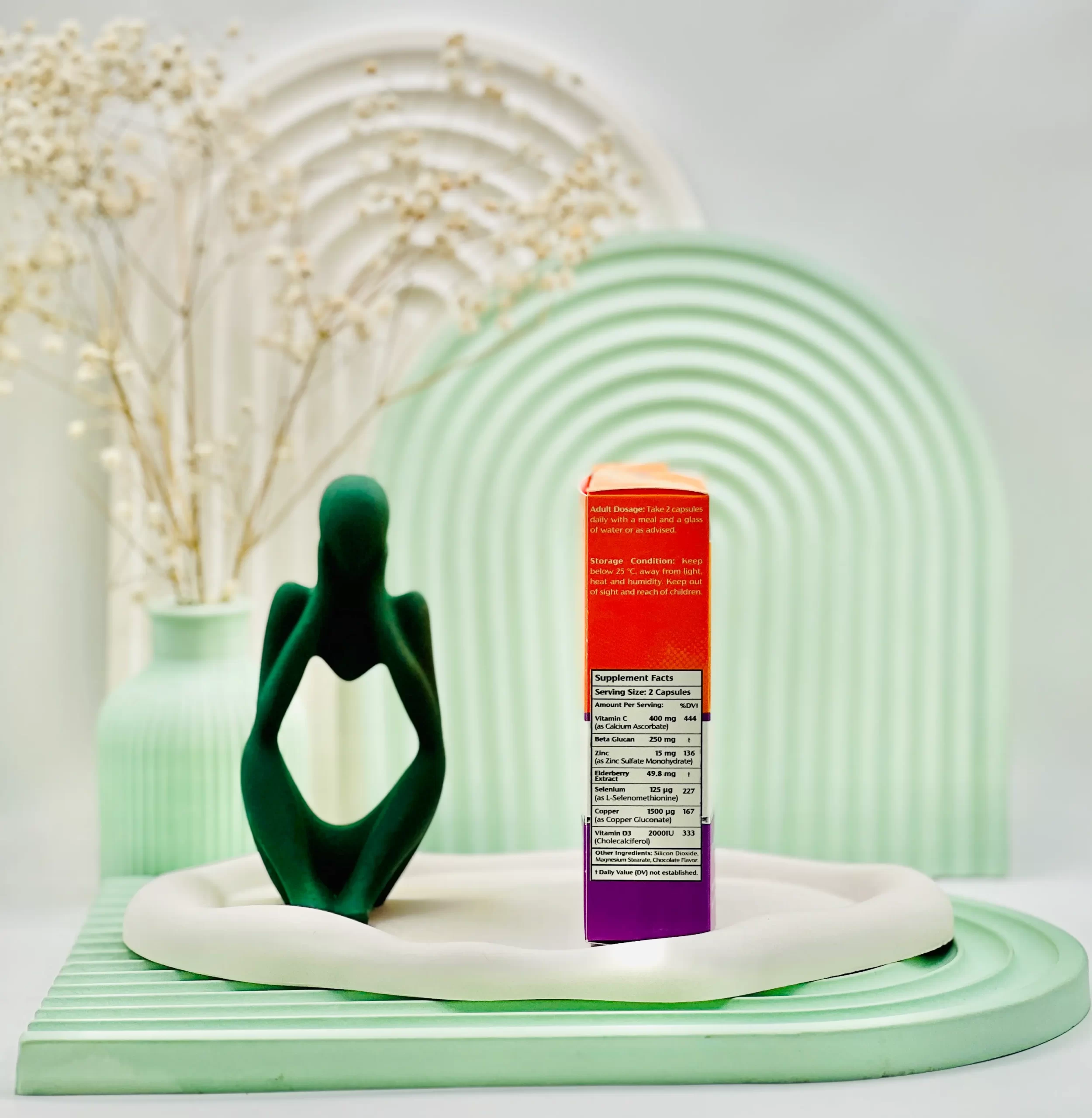 - تقویت سیستم ایمنی بدن: با ترکیباتی چون ویتامین C، بتاگلوکان، زینک و عصاره الدربری، این محصول به تقویت و بهبود عملکرد سیستم ایمنی کمک میکند.