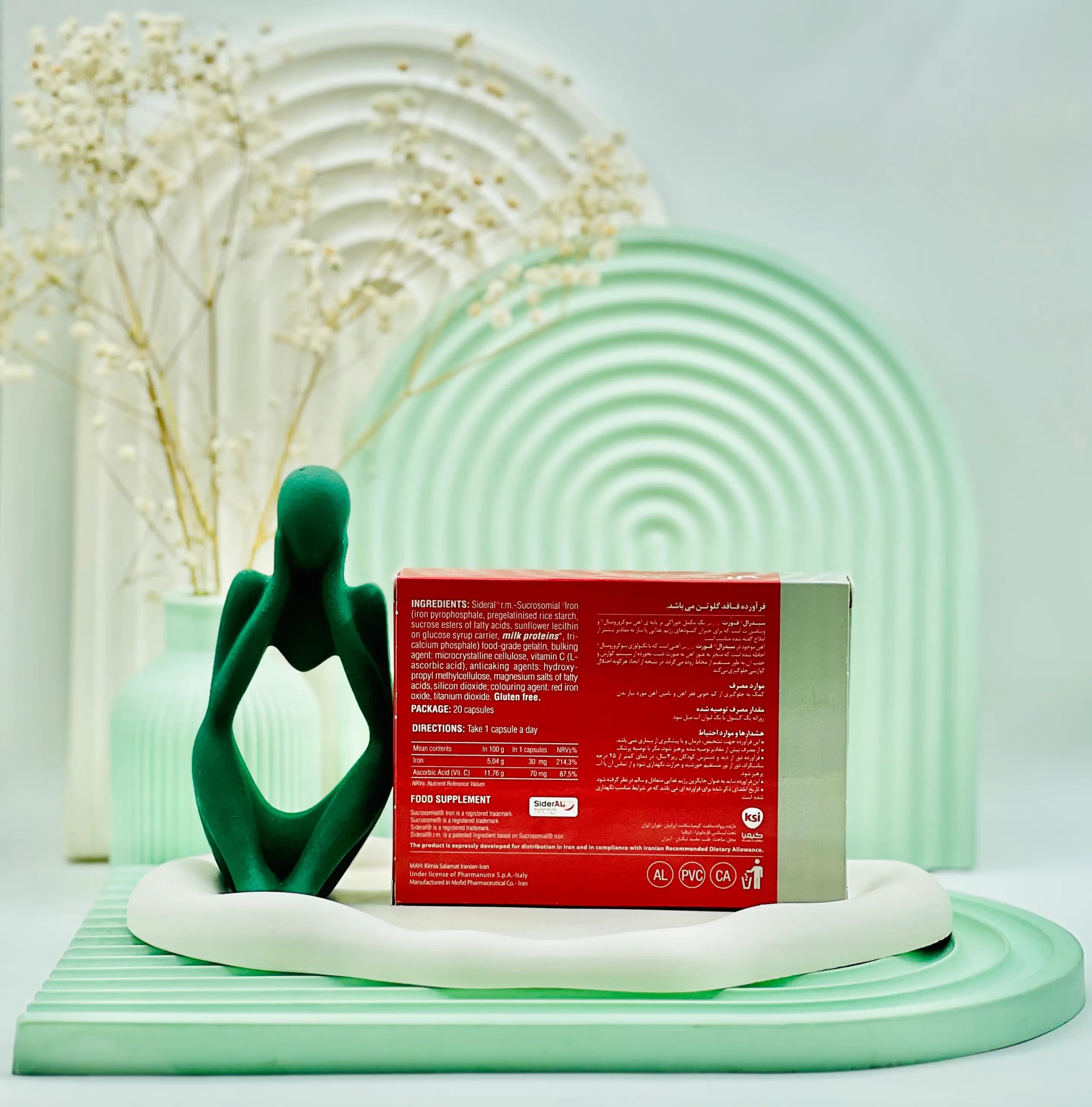 - حاوی 30 میلیگرم آهن و 70 میلیگرم ویتامین C در هر کپسول