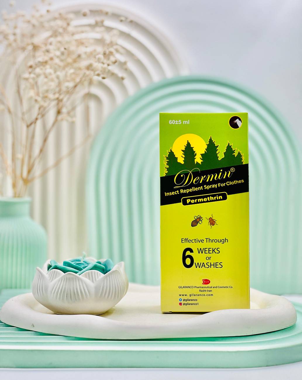 اسپری دافع حشرات درمین از محصولات موثر برای دفع حشراتی نظیر کنه، ساس، شپش و پشه از روی لباس و لوازم است. استفاده از این محصول باعث دریافت مقداری پرمترین توسط حشرات و در نهایت مرگ یا فرار آنها میشود.