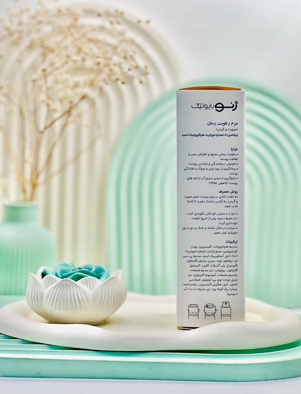 - سرم رطوبت رسان صورت و گردن ژنوبایوتیک حاوی هیالورونیک اسید است که قدرت جذب بالایی داشته و ضمن آبرسانی قوی پوست سبب حفظ رطوبت پوست در طول شبانه روز میشود.