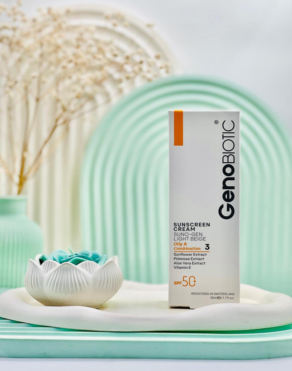 کرم ضد آفتاب SPF50 پوست چرب و مختلط ژنوبایوتیک رنگ بژ روشن 50 میلی لیتر