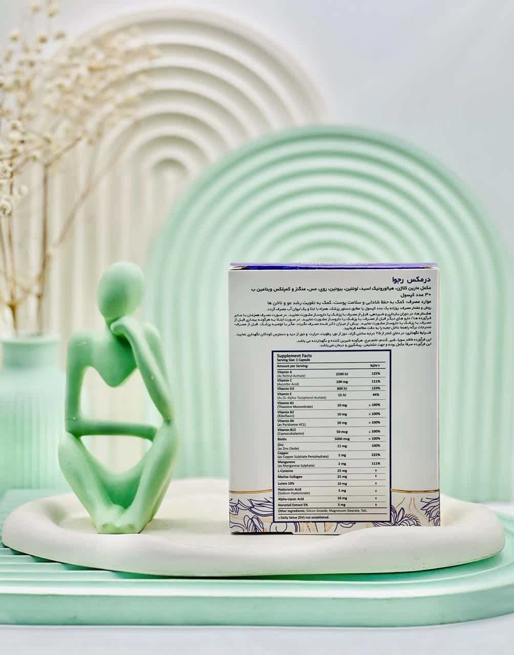 کپسول رجوا درمکس به عنوان یک مکمل پوست، مو و ناخن حاوی بسیاری از مواد طبیعی برای حفظ سلامت پوست و مو و ناخن میباشد که میتوان به سیستین، بیوتین، کلاژن دریایی، مس، منگنز و همچنین ویتامین های Cو Aو E میباشد که به سلامتی بدن کمک میکند. این محصول فاقد هرگونه مواد نگهدارنده مصنوعی، شیر، سویا، تخم مرغ، گلوتن و شیرین کننده های مصنوعی میباشد.