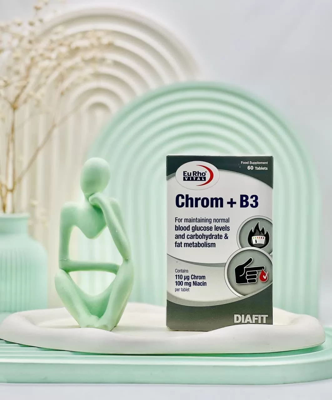 قرص کروم و ویتامین B3 یوروویتال یک مکمل رژیمی و غذایی و کمک درمانی ایده آل بوده، که کمک کننده عملکرد انسولین، تنظیم قندخون، چربی سوزی و متابولیسم کربوهیدرات ها است. نقش مهمی در پیشگیری از بیماری دیابت، افزایش چربی خون و چاقی دارد.