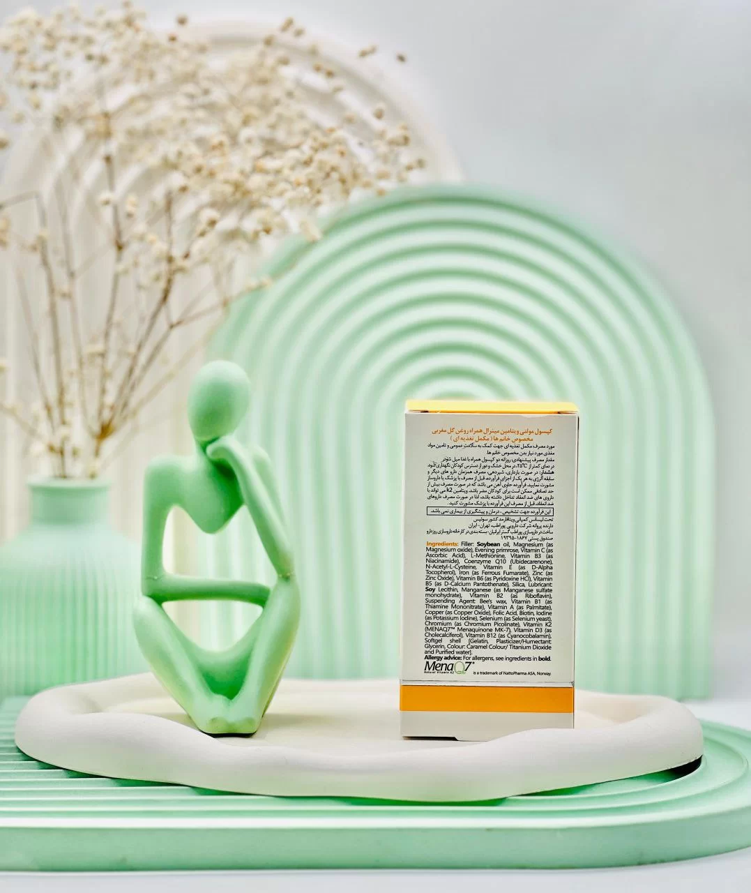 ترکیبات شاخص (در هر ۲ سافت ژل) | ویتامینها: ویتامین A (۲۵۰۰ IU) – ویتامین D3 (۶۰۰ IU) – ویتامین E (۳۰ IU) – ویتامین C (۹۰ mg) – ویتامین K (۴۵ µg) – ویتامینهای گروه B (B1 تا B12) – اسید فولیک (۸۰۰ µg) – بیوتین (۱۵۰ µg) – پانتوتنیک اسید (۱۰ mg) مواد معدنی: منیزیم (۱۰۰ mg)، زینک (۱۵ mg)، آهن (۱۸ mg)، مس (۱ mg)، منگنز (۳ mg)، سلنیوم (۵۵ µg)، کروم (۵۰ µg)، ید (۱۵۰ µg)، سیلیکون (۱۰ mg) سایر ترکیبات: روغن گل مغربی (۱۰۰ mg)، کوآنزیم Q10 (۳۰ mg)، المتیونین (۴۰ mg)، ان-استیل سیستئین (۳۰ mg) |