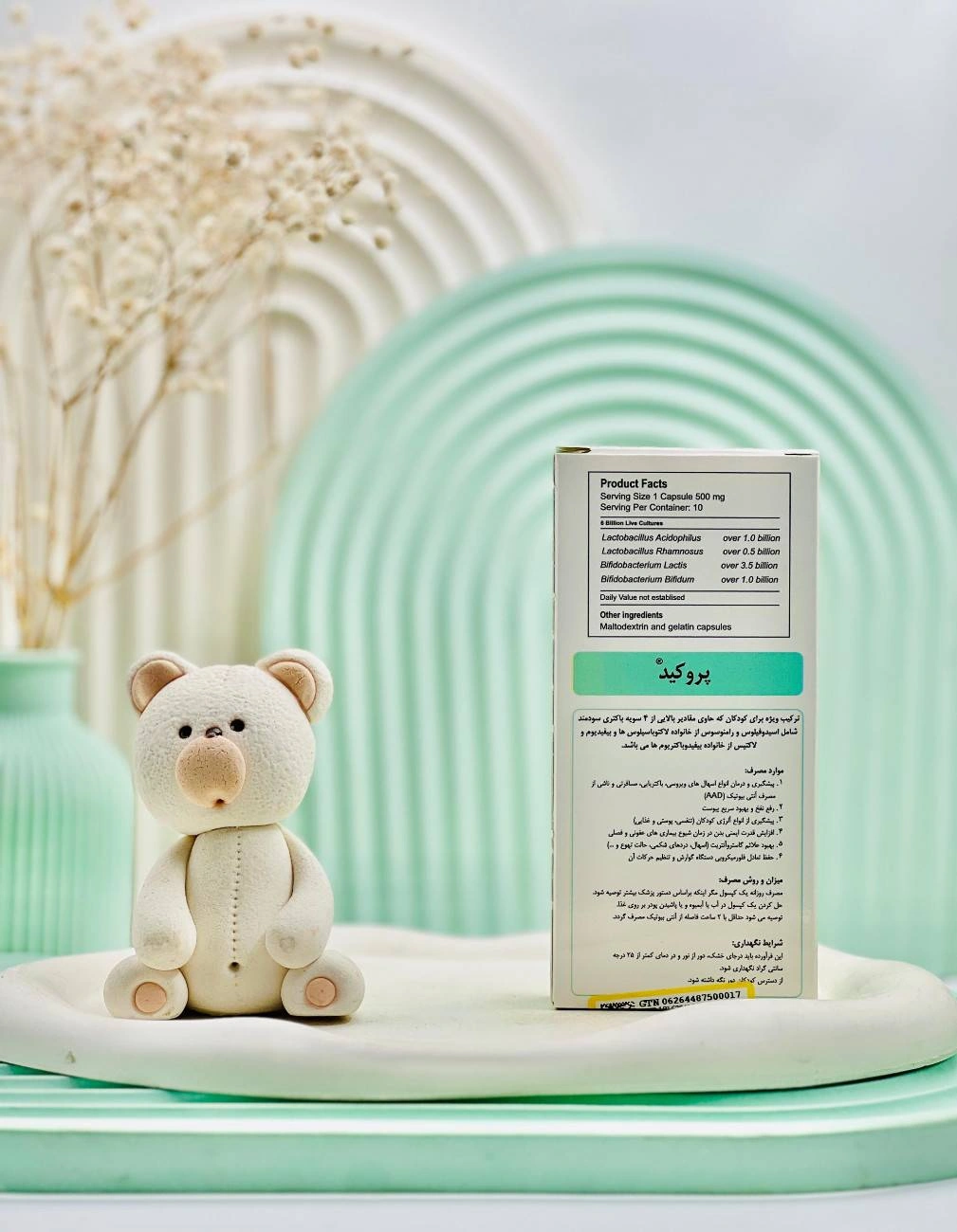 کپسول پروکید یک فرآورده ویژه پروبیوتیک برای کودکان بوده و حاوی مقادیر بالایی از 4 سویه باکتری سودمند یعنی اسیدوفیلوس و رامنوسوس از خانواده لاکتوباسیلوسها و بیفیدیوم و لاکتیس از خانواده بیفیدوباکتریومها میباشد. این مکمل پروبیوتیک در درمان و پیشگیری از اسهال، بهبود نفخ و یبوست، تقویت سیستم ایمنی کودک، سلامت دستگاه گوارش کودک و جلوگیری از انواع آلرژی در آنها موثر است. این مکمل فاقد گلوتن است و کودکان مبتلا به سلیاک نیز قادر به استفاده از آن میباشند.