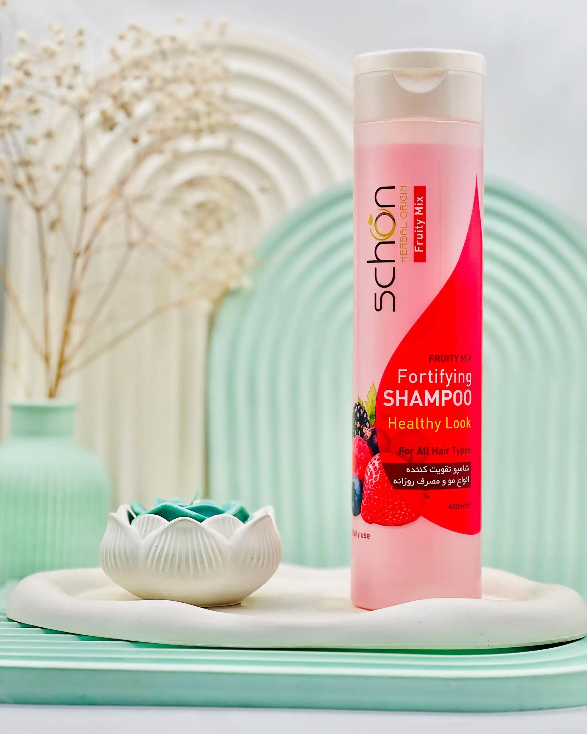 این شامپو تقویت کننده حاوی ریز مغذی هایی است که باعث تقویت مو میشود. میوه ها علاوه بر محافظت از مو در برابر آلاینده های محیطی، باعث تقویت و درخشان شدن مو نیز میشود. همه شامپو ها مناسب جهت مصرف روزانه نمیباشند اما شامپو فورتیفایینگ شون را میتوانید به صورت روزانه استفاده کنید.