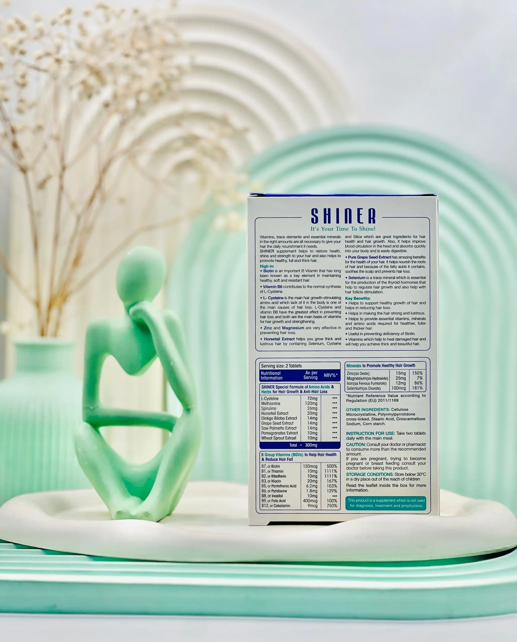 قرص شاینر، علاوه بر حفظ سلامت عمومی و تامین مواد مغذی مورد نیاز بدن به تقویت و حفظ سلامت موها، درخشندگی، بهبود استحکام و افزایش تراکم مو کمک میکند.