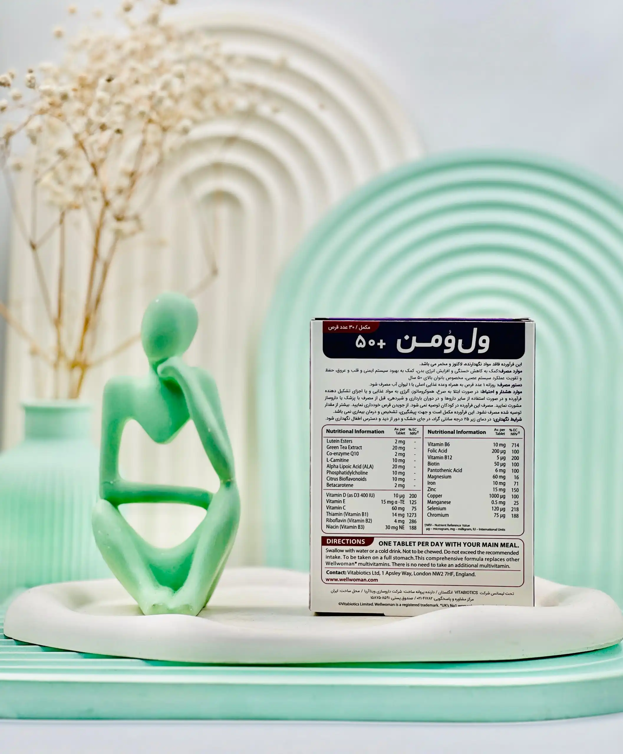 قرص مولتی ویتامین ول ومن +50 مخصوص خانمهای بالای 50 سال، محصول شرکت ویتابیوتیکس انگلستان و واردشده توسط آرمان فارمد دارو است. هر جعبه حاوی 30 عدد قرص میباشد.